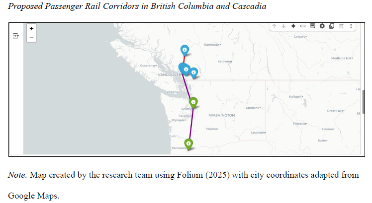 This report considers aspects of passenger rail station location in relation to the proposed Whistler Passenger Rail Development, Cascadia cross-border high-speed rail upgrades and the socio-economic effects of a proposed passenger rail station in Surrey, BC. The analysis uses 2025 demographic estimates, economic reports, environmental analysis, and transportation planning analysis. Four areas are highlighted, population density, accessibility, economic impact and environmental considerations.