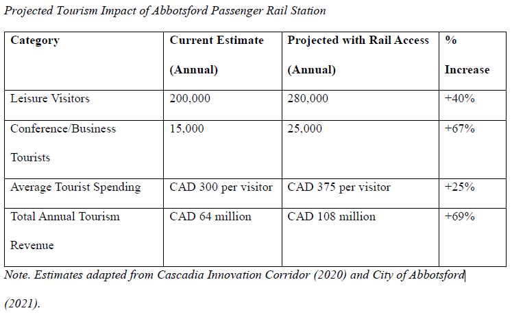 This report discusses the possible socio-economic, environmental, and regional effects of a passenger rail station being set up in Abbotsford, British Columbia. Being conveniently situated along the Cascadia Corridor of Vancouver and Seattle, Abbotsford has a good chance to develop into a connector hub connecting the suburban and rural population with the international markets. It is evident that, according to the analysis, the project will create more than 2,000 direct and indirect jobs, grow tourism revenues by almost 70 percent, and increase the value of properties around the station by the creation of transit-oriented development. The social benefits would include increasing accessibility among students, seniors, immigrants, and low-income groups, whereas the environmental benefits would include decreasing congestion on Highway 1 and eliminating thousands of tons of CO₂ emissions on an annual basis. In comparison to the established hubs in Vancouver, Calgary, and Edmonton, the strength of Abbotsford lies in its ability to balance affordability, equity, and sustainability. Through strategic planning, Abbotsford will be able to become a strong, competitive, and inclusive regional hub.
